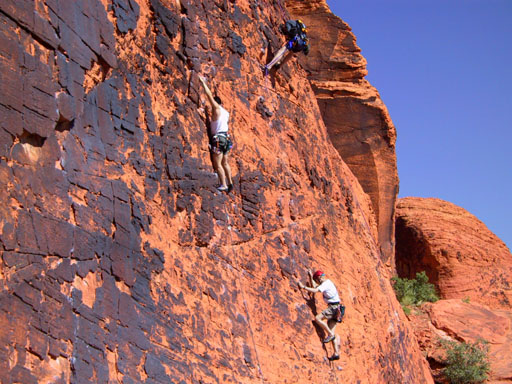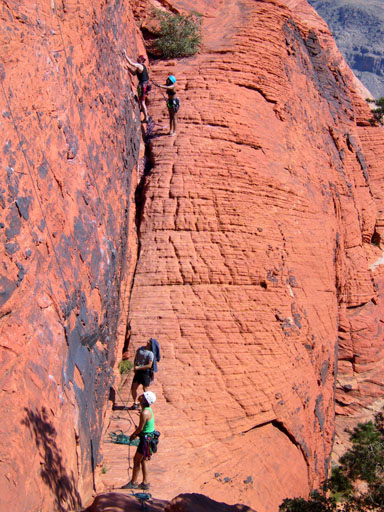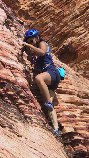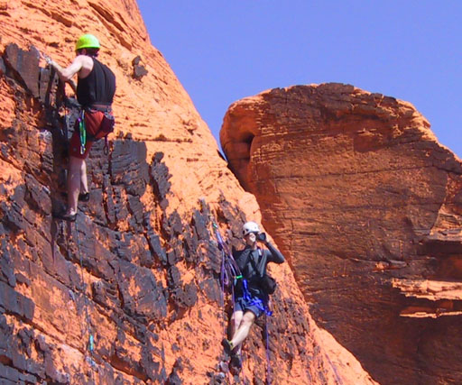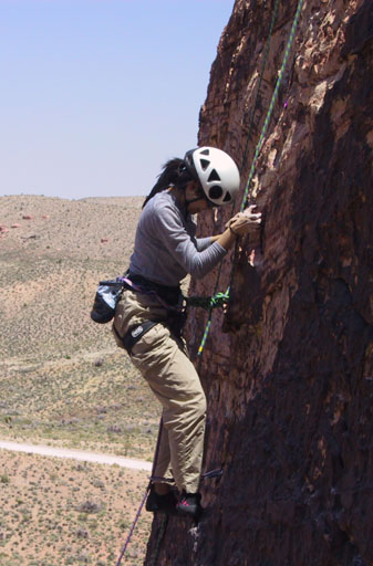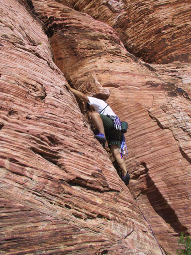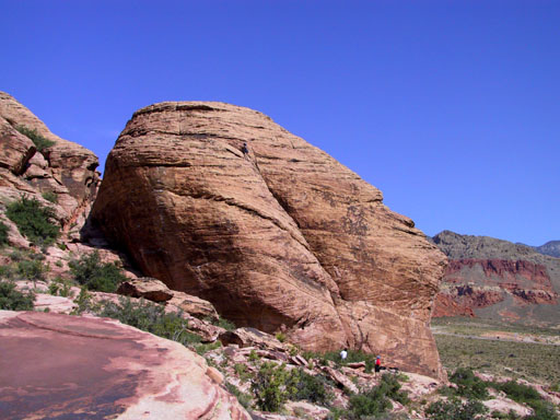 After a rest day, I decided to try leading a trad route and headed back to Calico Basin. This time we went to the Cannibal Crag area. That's Marelyne climbing the big rock on the right.